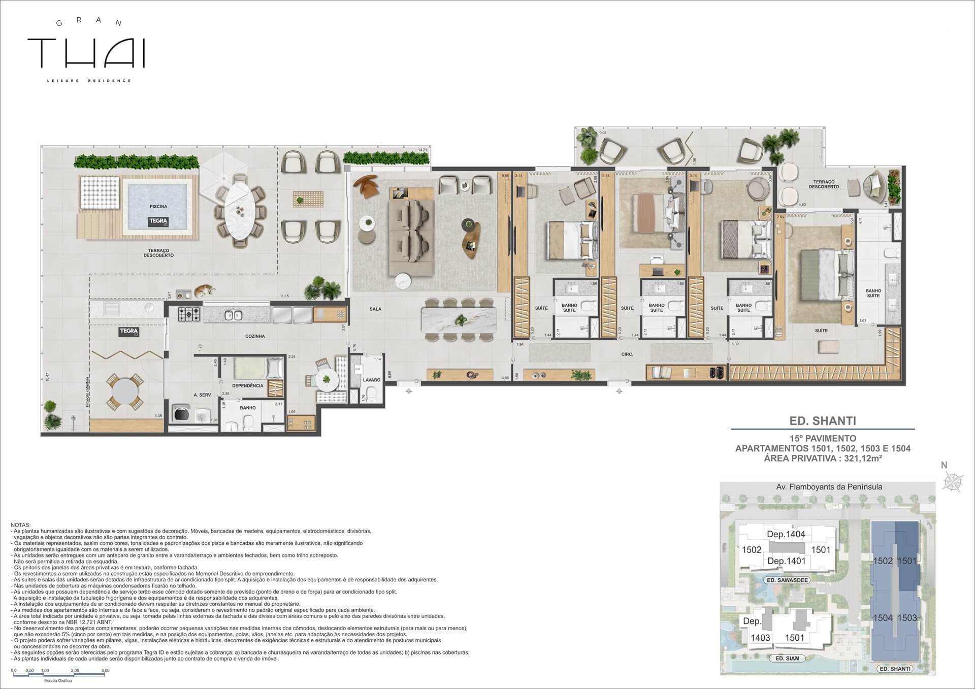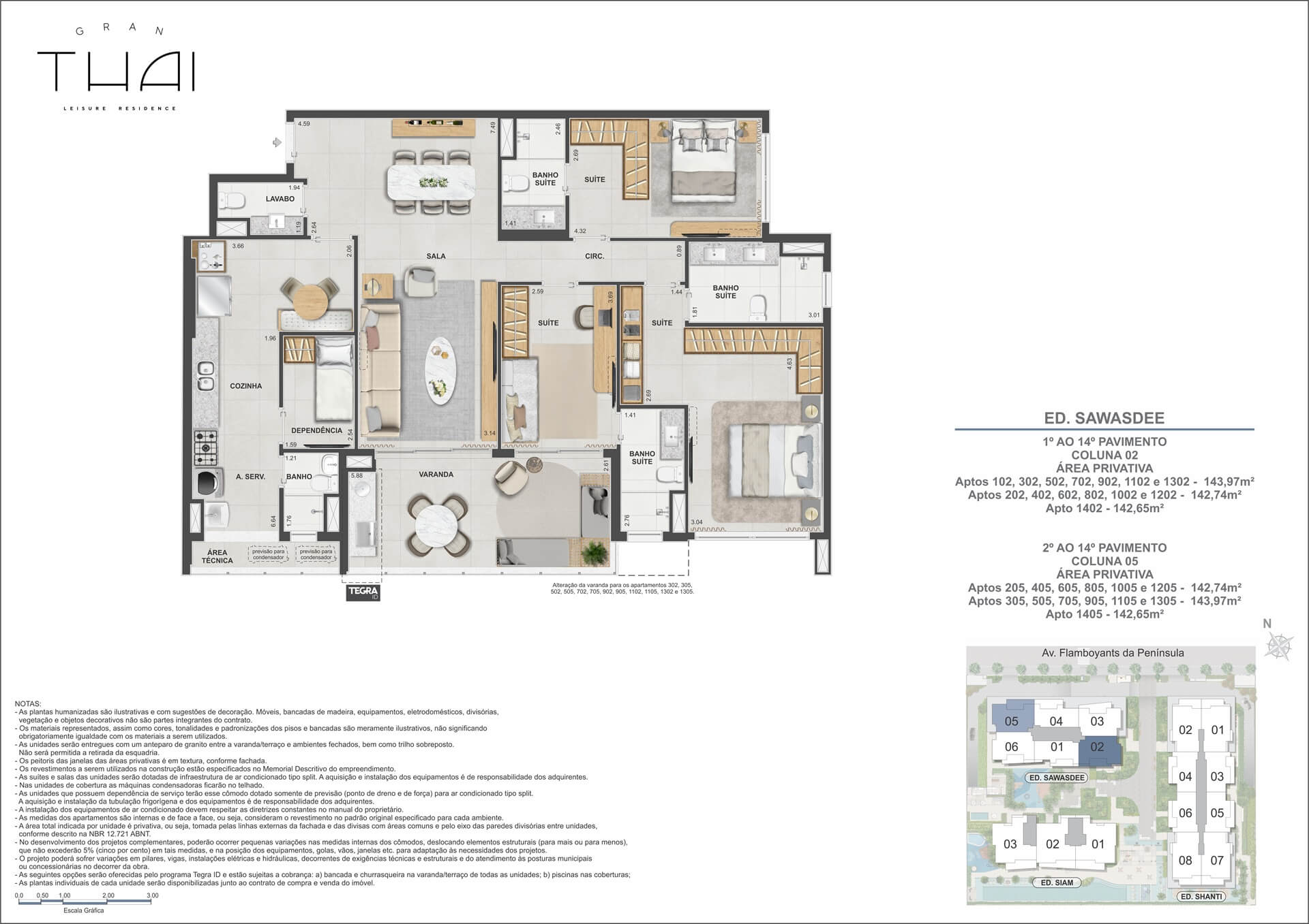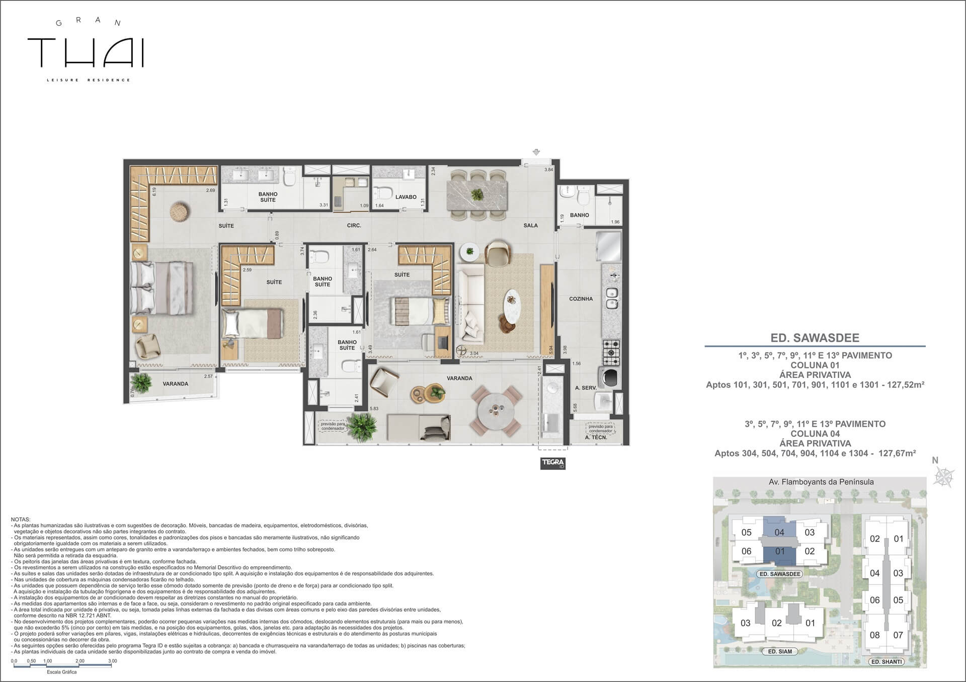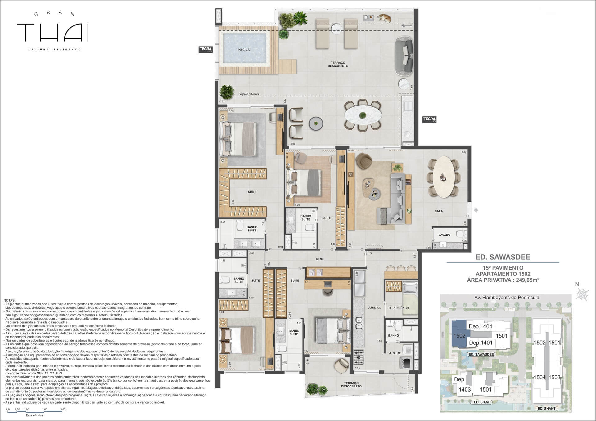 O Gran Thai Península conta com amplos apartamentos com metragens que variam de 125m² a 210m² com 3 ou 4 Quartos além de UP Gardens e coberturas de 162 a 405m²