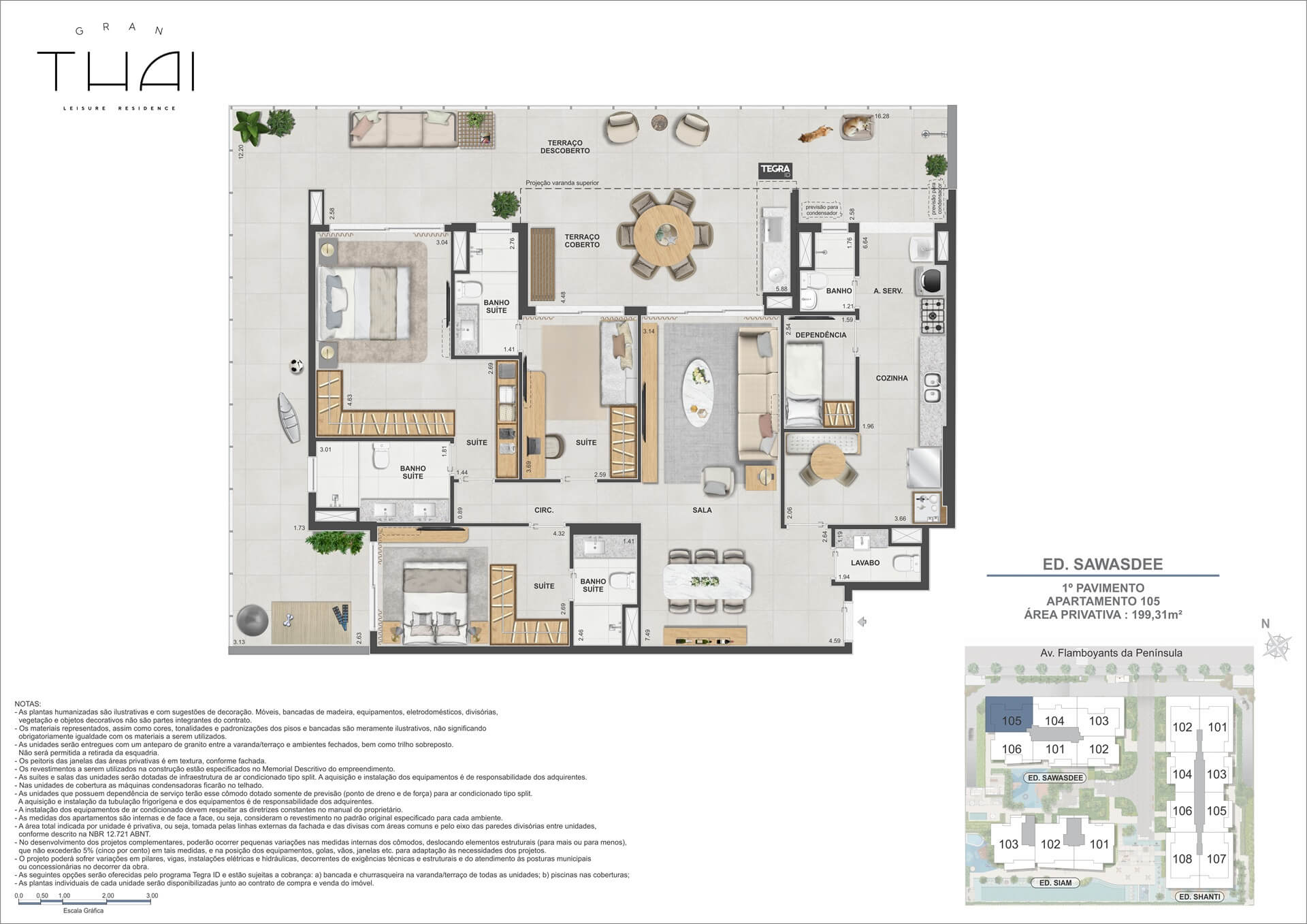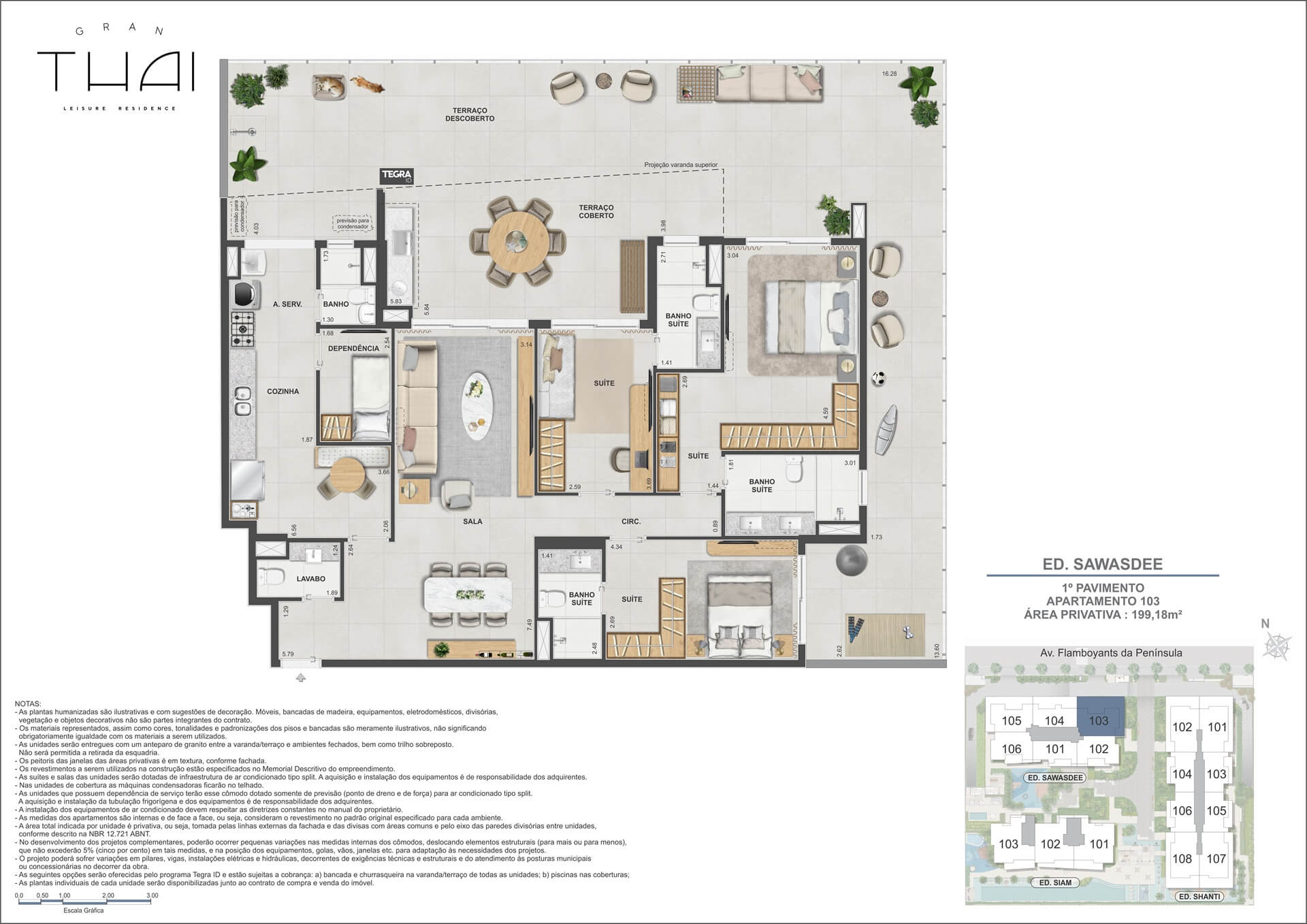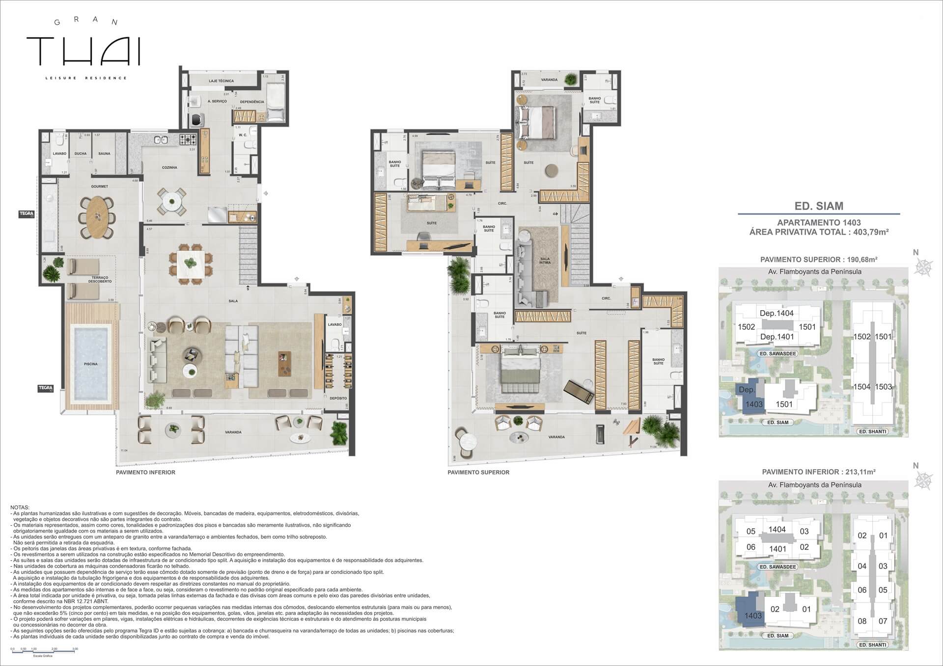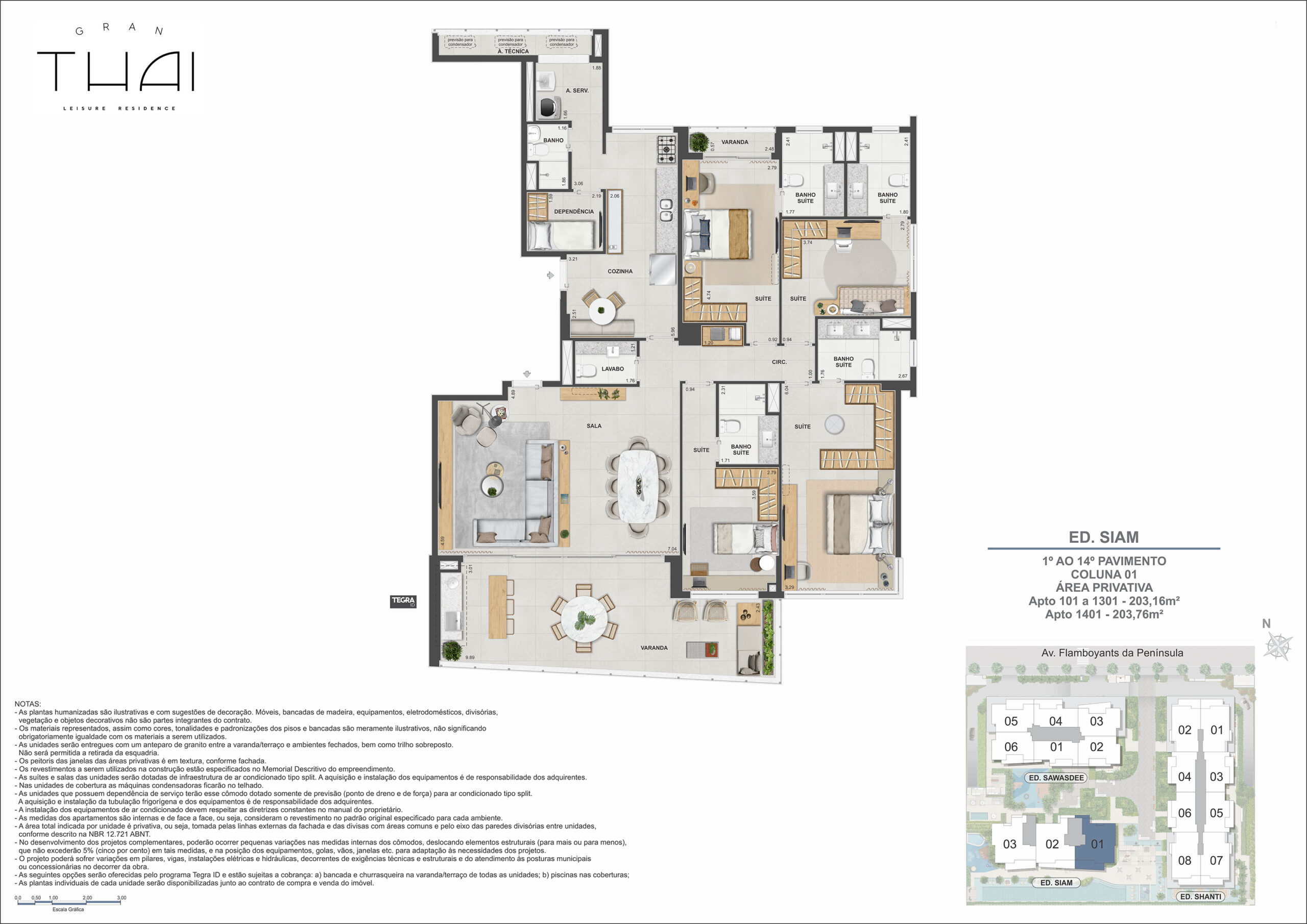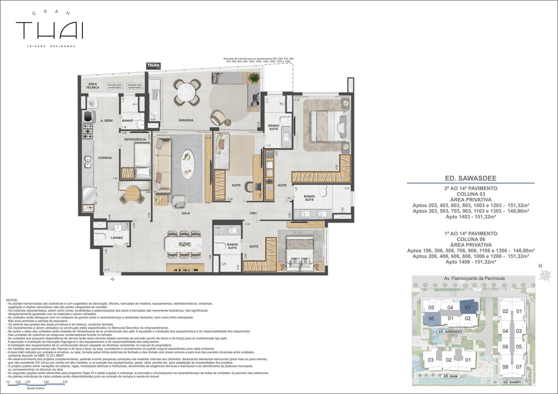 O Gran Thai Península conta com amplos apartamentos com metragens que variam de 125m² a 210m² com 3 ou 4 Quartos além de UP Gardens e coberturas de 162 a 405m²
