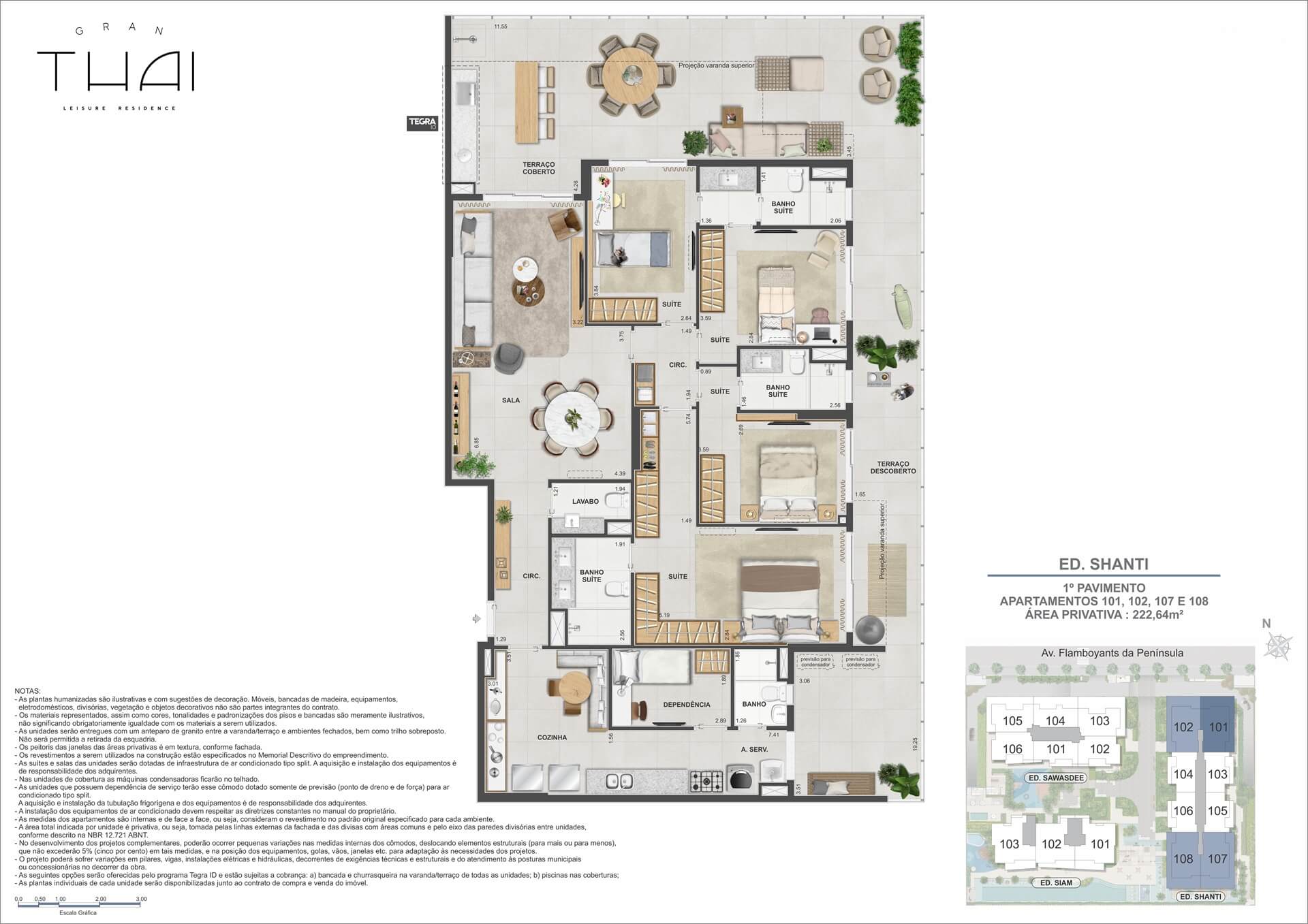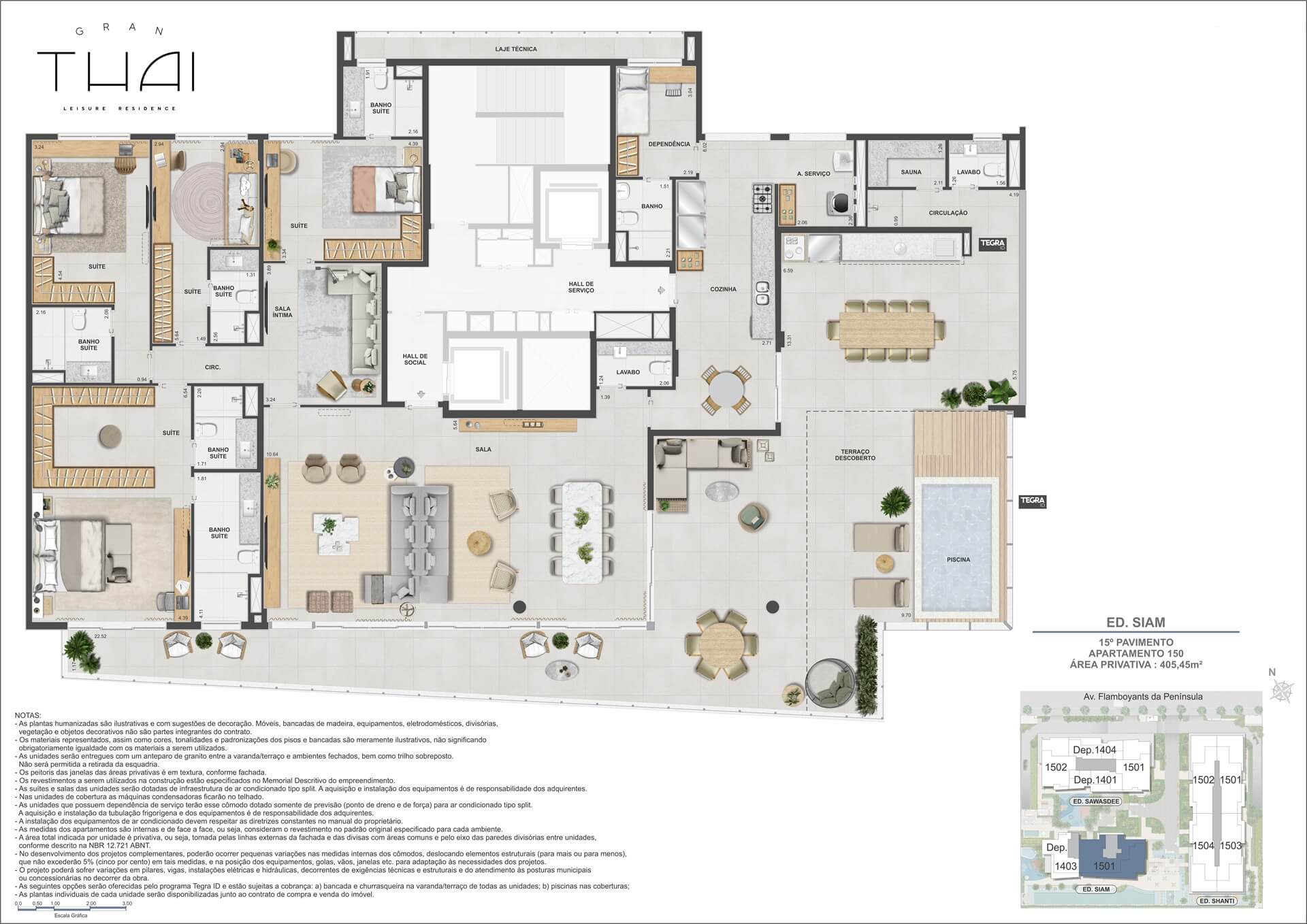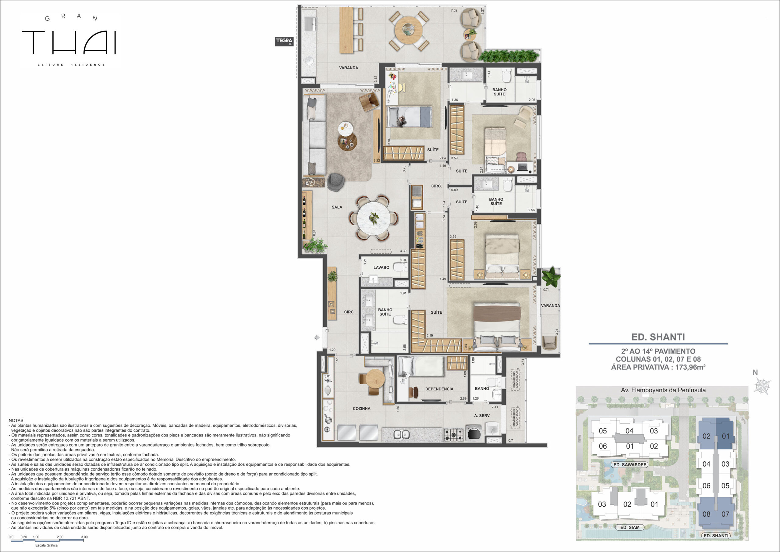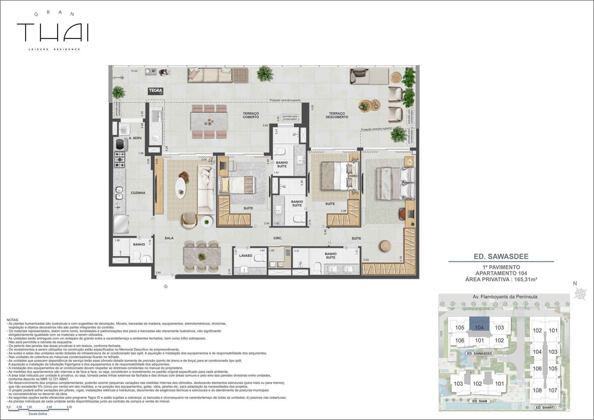 O Gran Thai Península conta com amplos apartamentos com metragens que variam de 125m² a 210m² com 3 ou 4 Quartos além de UP Gardens e coberturas de 162 a 405m²